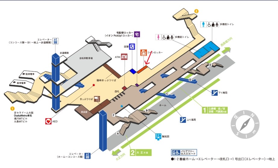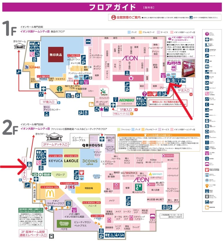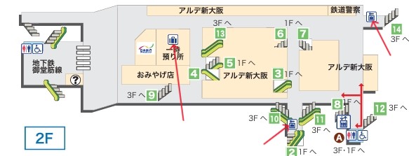 画像右側の2か所の矢印がコインロッカーの位置です。