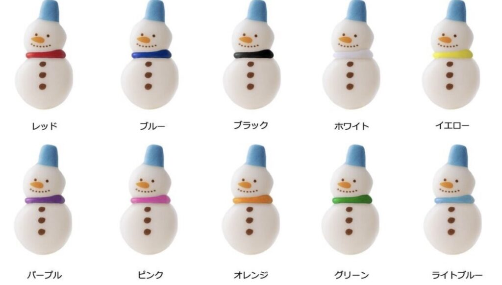 なんとその雪だるまチョコレートのマフラーはそれぞれ好きな色に選ぶことができ、全10色あります。