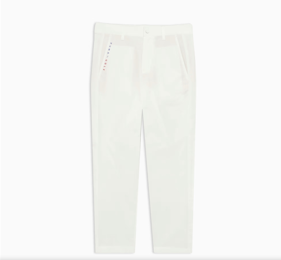 芝に映えそうなきれいな白いパンツで、ポケットの縁の刺繍がアクセントとなっています。