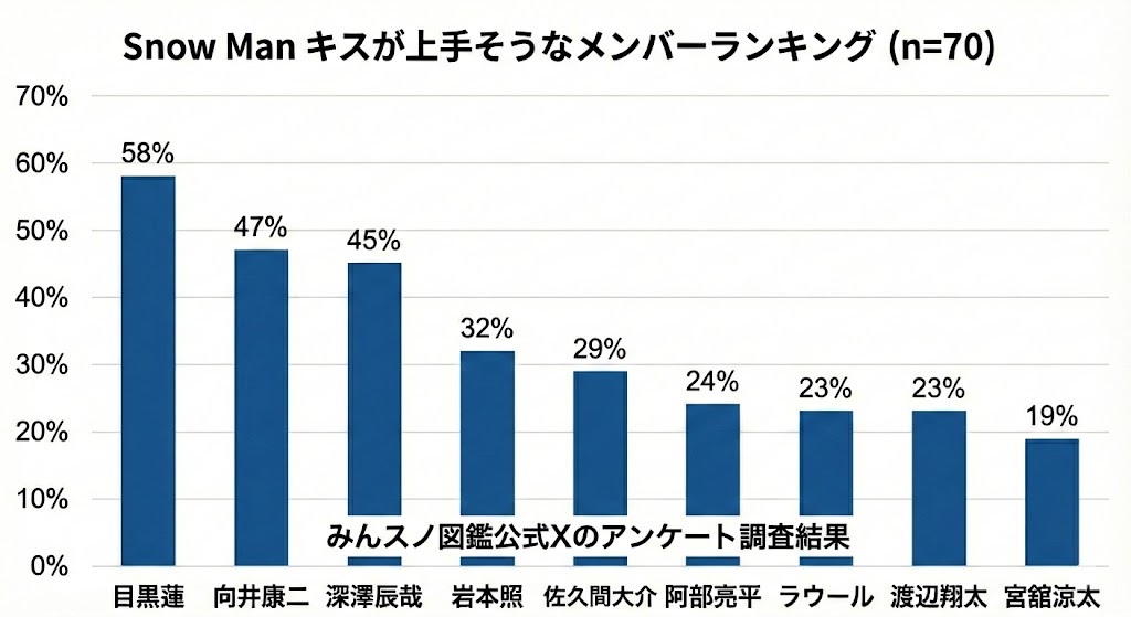 みんスノ図鑑の公式Xでファンの皆様に【SnowManでキスが上手そうなメンバーランキング】と題して調査しました。