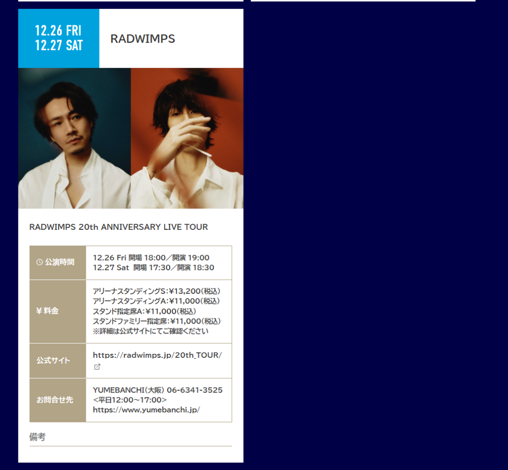 | ぴあアリーナMM | ポルノグラフィティ | 利用不可 ✖ |