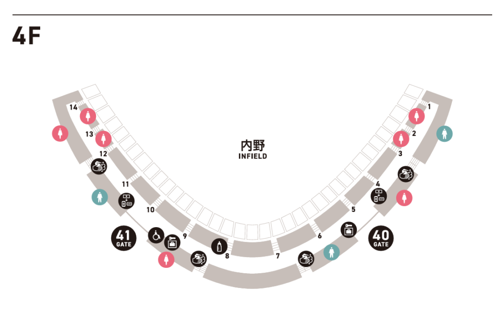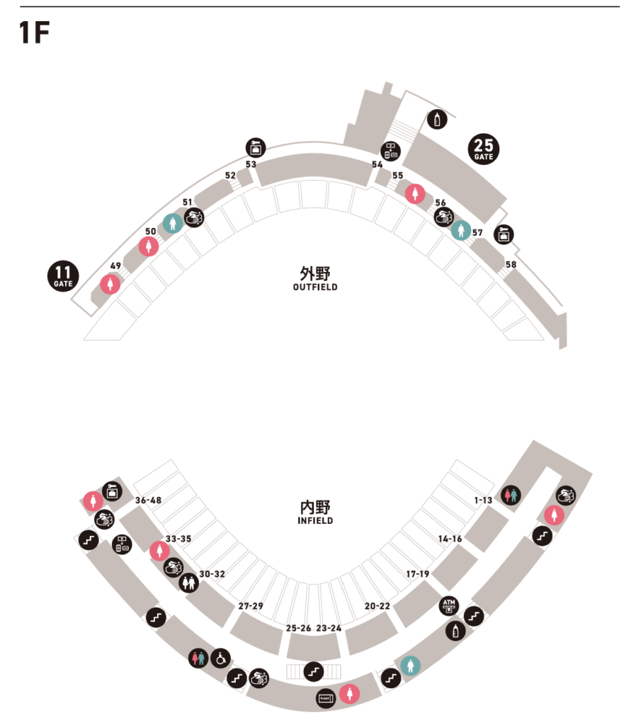 | 内野1F 3塁側30〜32通路付近 | 多目的トイレがあり、オストメイト対応・介護ベッド付きで、車椅子ユーザーや介助が必要な人でも使いやすい設備がそろっているエリア |